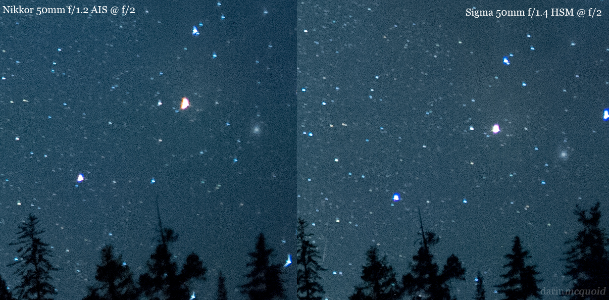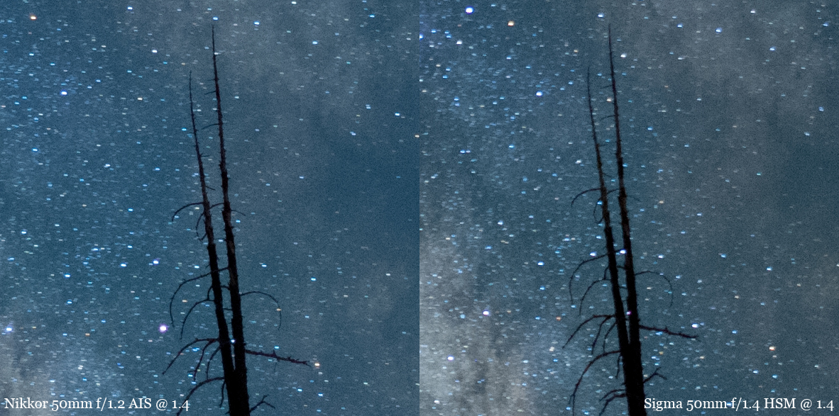 night star images vs the Nikon 50mm f/1.2 or Sigma 50mm f/1.4. Resized