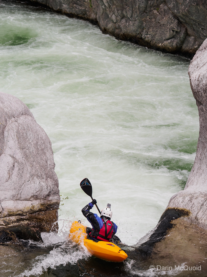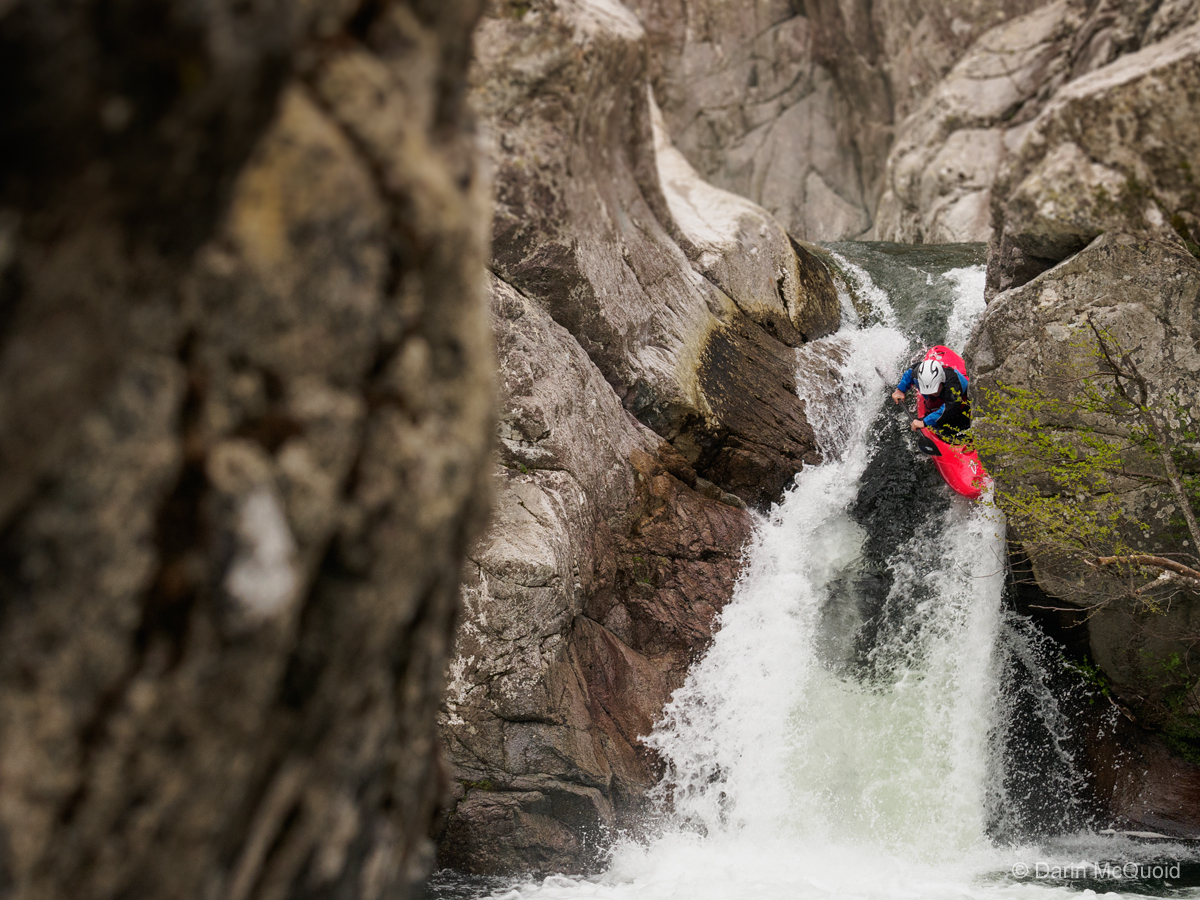 Rok Sribar dropping into one of the most famous rapids in Corsica, the Red Rocket on the Fium Orbo.