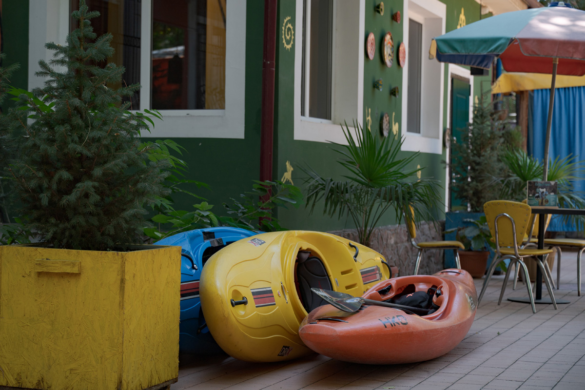 The hostel's color scheme compliments our kayaks.