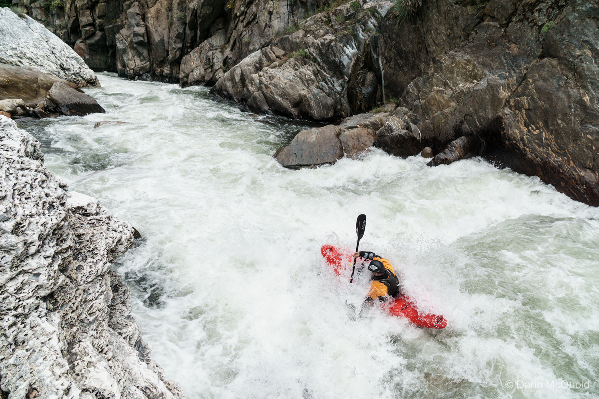Eric Giddens boofing through our first scout of the day. Look at all that crazy rock on shore.